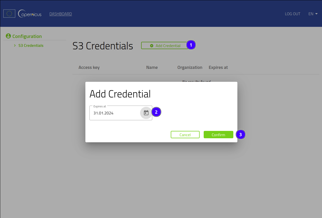 In order to obtain secrets, visit page and log in with the Copernicus Data Space Ecosystem account for which the keys are to be generated. After successfully logging in, indicate the expiration date of the secrets using the “Add Credentials” button and click “Confirm”.