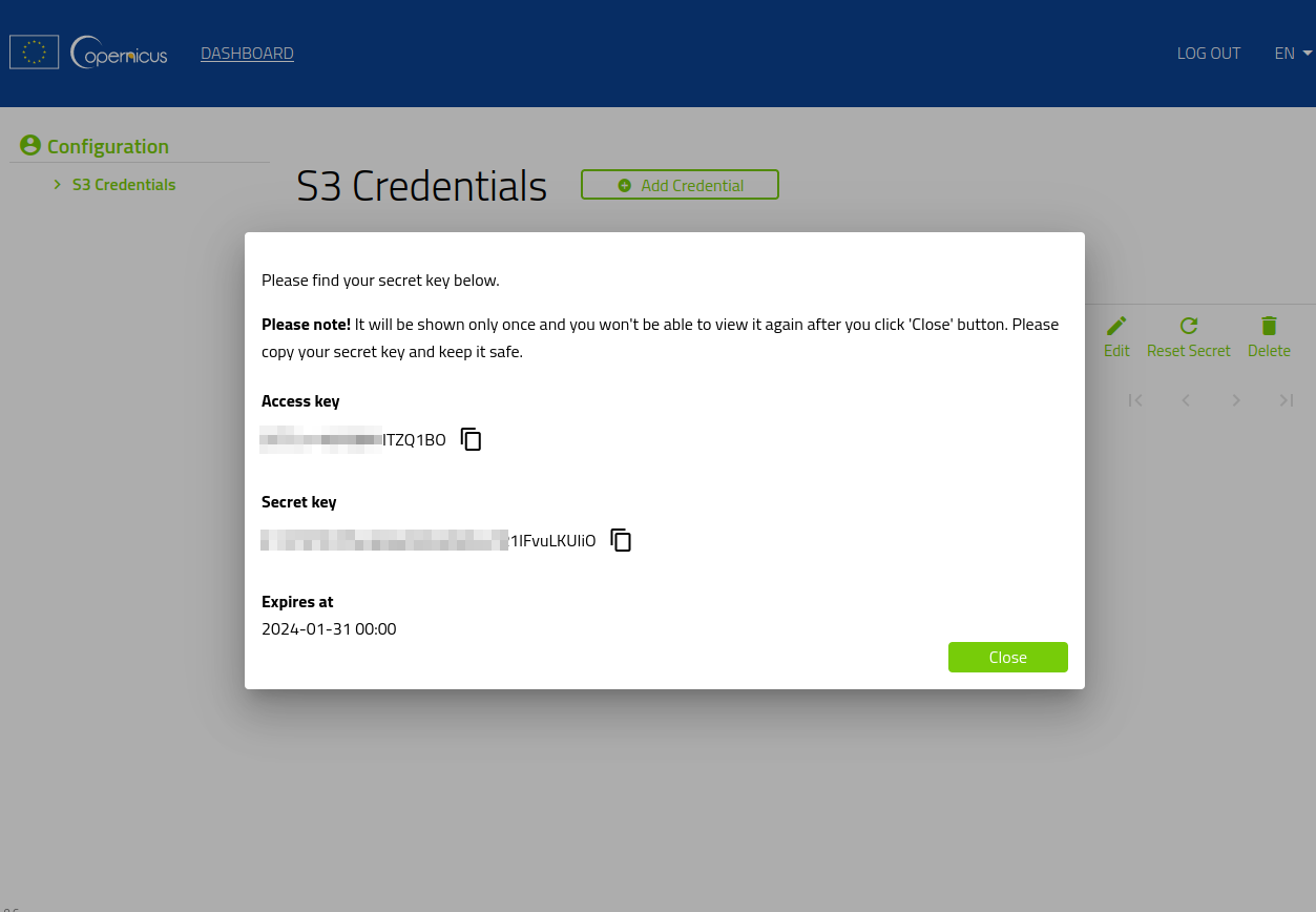 In order to access EOData via S3 you must obtain secrets (access and secret key). Please visit following page and log in with Copernicus Data Space Ecosystem account for which the keys are to be generated.