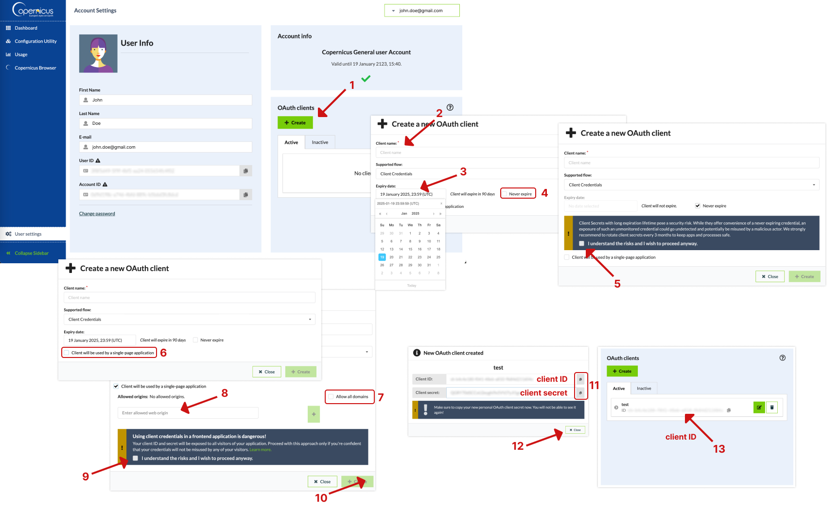 To register an OAuth client, open the “User Settings” tab in the Dashboard app and locate the “OAuth clients” section. Click on the Create button (1). Provide a name for your OAuth client (2). You can select the Expiry date for your client (3) or select “Never expire” if you want your OAuth client to be indefinite (4). For OAuth clients without expiration you will need to confirm your understanding of risks (5). If your OAuth client will be used by a single-page application (SPA), select the corresponding option (6). If the SPA option is selected, you'll be prompted to choose between "Allow all domains" (7) or specify the web origins (8) from which the OAuth Client will be used. Confirmation is required if you selected to use the OAuth client in a frontend application, acknowledging the risks of exposure (9).