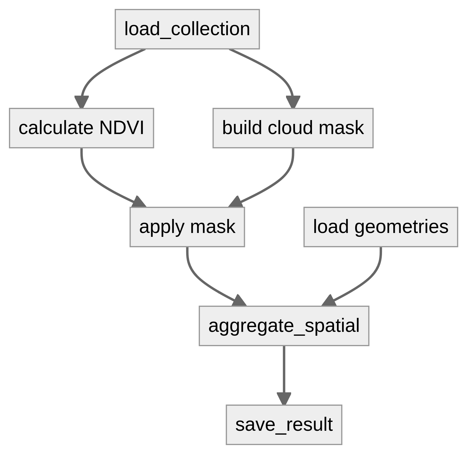 Processes in openEO are operations that can be applied on (EO) data (see the the openEO glossary for more info). For example: calculate the mean of an array, mask out pixels outside a given polygon or calculate spatial aggregations. The output of one process can be used as the input of another process, and by doing so, multiple processes can be connected that way in a larger “process graph”, as illustrated in this conceptual diagram: