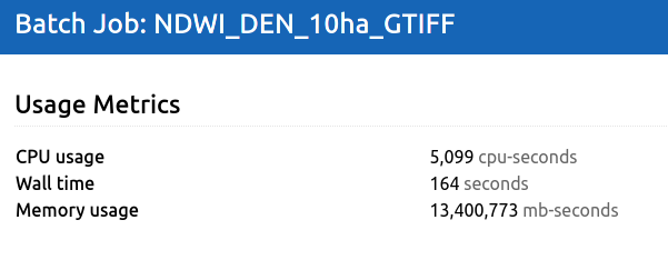 For example, consider a scenario where we compute a Sentinel-2 based NDWI for 10 hectares, resulting in a series of GeoTiffs (one for each observation). When running this example, the batch job reports its usage, which can be monitored in the OpenEO Web Editor by clicking the