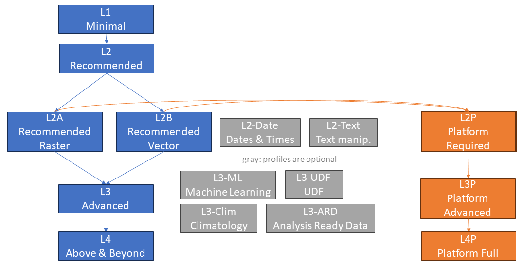 In addition to the general openEO Processes specification and their Processes Profiles, the CDSE openEO federation requires the implementation of an additional Process profile, namely L2P: Required - openEO. This requires one of the following openEO profiles L2A: Recommended (Raster) or L2B: Recommended (Vector). Additionally, there are two openEO Platform-specific profiles with additional requirements: L3P: Advanced - openEO and L4P: Complete - openEO Platform.