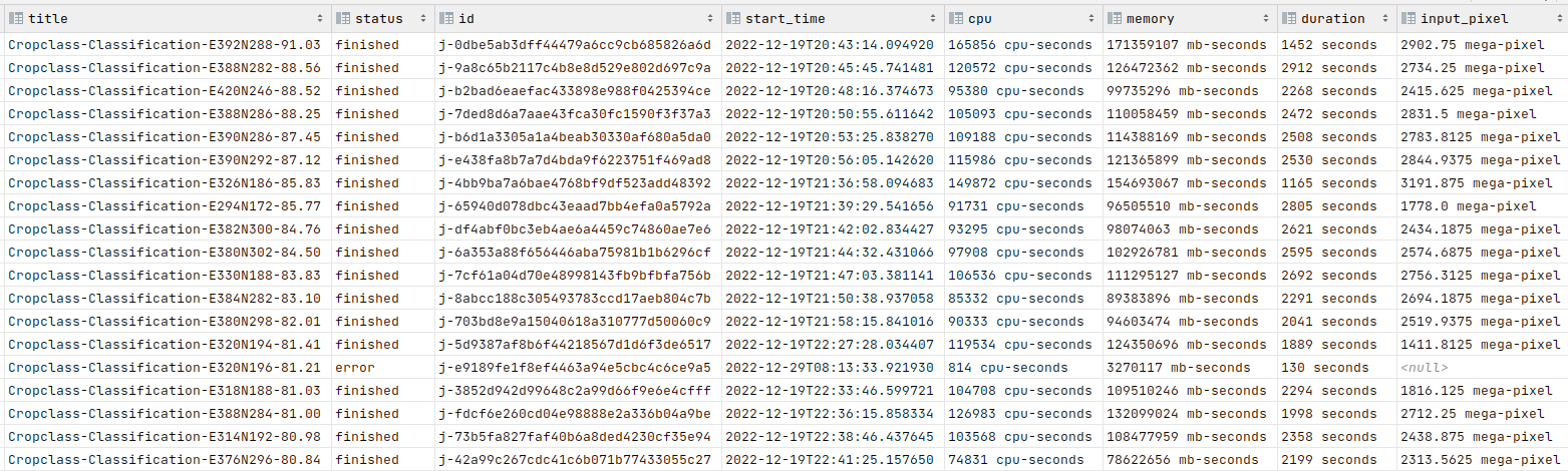 Before starting large-scale processing, users should verify that the correct output is generated and that they have sufficient credits and resources to complete their jobs. This can be achieved by running test jobs and analyzing the statistics reported in the metadata to determine average parameters. (Refer to the map production section below for guidance on collecting these parameters in a CSV format.)
