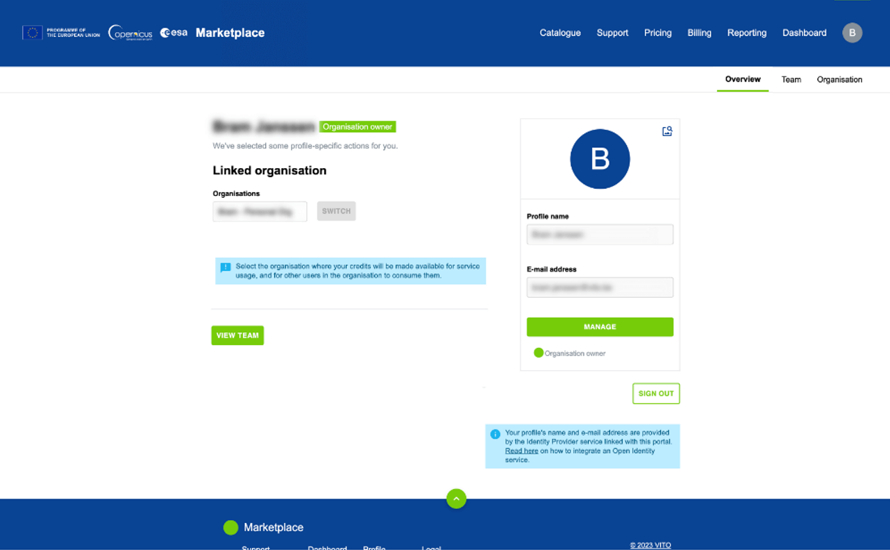 The Overview section presents profile details such as name, email, and affiliated organization. These details can be updated by clicking the MANAGE button. Meanwhile, in the Team sub-menu, a list of all organization members is displayed. This list can also be accessed by clicking the VIEW TEAM button at the bottom left of the Overview sub-menu. Further information on team management can be found here. Lastly, within Organisation sub-menu, organization information such as name, email address, website, VAT number, and more can be viewed and modified.