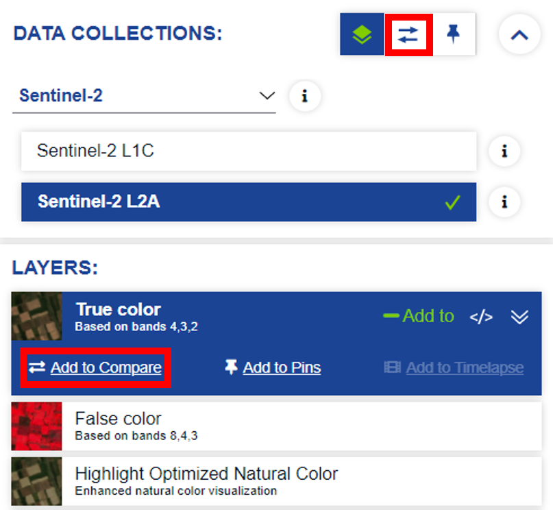 To compare two (or more) visualizations you must add them to the compare panel. You can add a visualization to the compare panel by clicking on the Add to compare button in each visualization layer (see Fig. 4). When you have added all the layers you want to compare to the compare panel, you can switch to it by clicking on the compare icon (