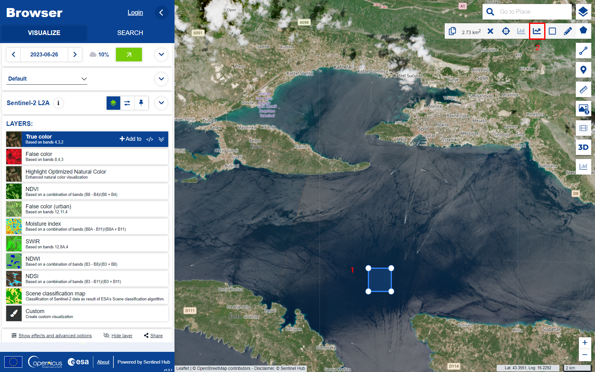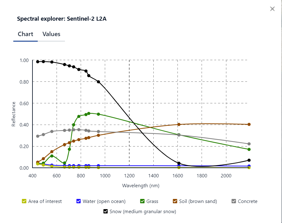 The Spectral Explorer analyses the various bands of the multi-spectral imagery to extract the spectral signature and helps to identify the scene in the region of interest. You can follow these steps to see a simple example of this feature. Note that this feature is only available for Sentinel-2 imagery at the moment.