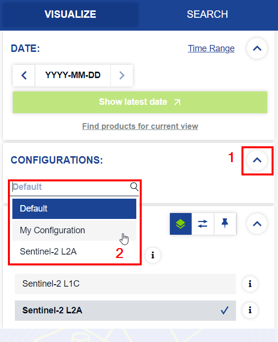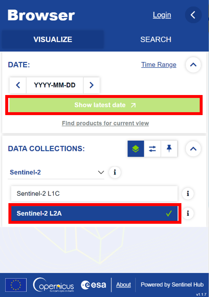 Fig 2: VISUALIZE tab with show latest date button and Sentinel-2 L2A collection highlighted