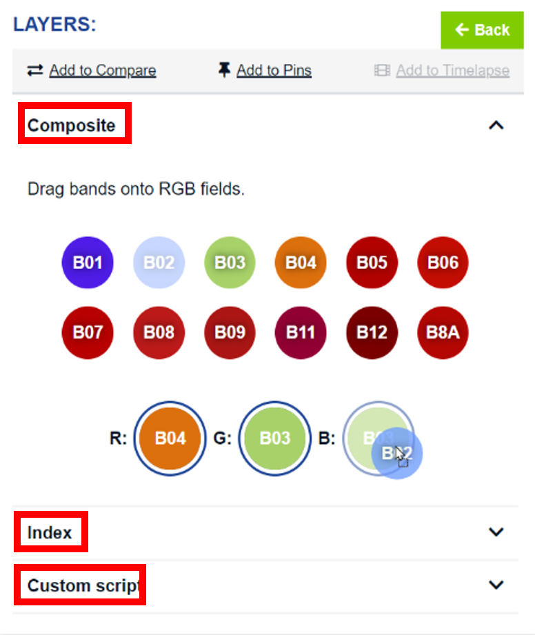 Here you can create a custom R/G/B composite or Index (band ratio, normalized difference index) by dragging and dropping the Sentinel-2 bands into the appropriate circles or use the Custom script functionality to insert a piece of JavaScript code.