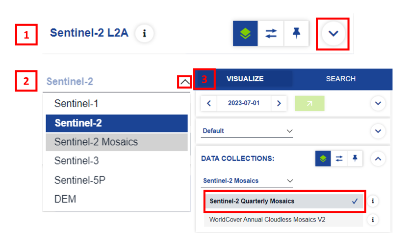 - Click on the drop-down arrow next to Sentinel-2 and select Sentinel-2 Mosaics. You will get two options to choose from because there are Quarterly and Annual Mosaics available. Choose