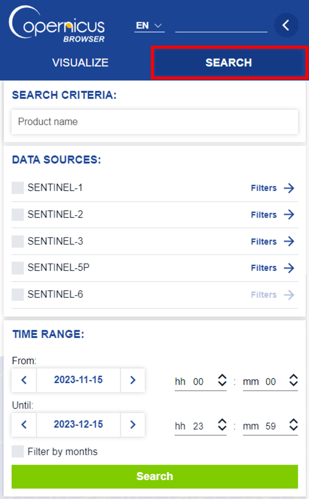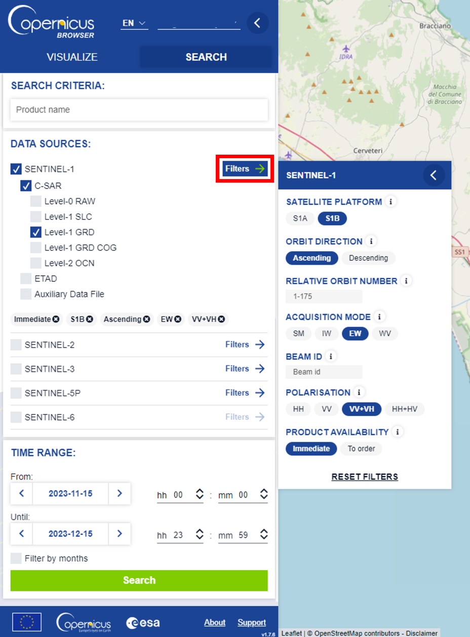 To get more suitable results, you can also select or choose additional filters as shown in Figure 11. 1. Select the Data Source and the appropriate instrument/ processing level. 2. Click on the Filter button and set the filtering parameters. 3. Press the Search button. Here, you can choose various parameters depending on the chosen Data Source. For example, you can see the filter parameters for Sentinel-1 in figure below, letting you filter the results based on satellite platform, orbit direction, relative orbit number, acquisition mode, Beam ID and polarization.