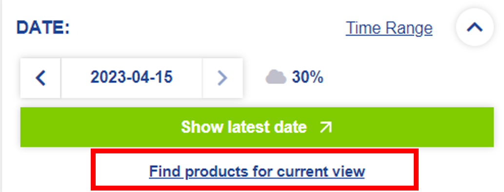 When you are visualizing data (chapter Visualizing data), you can easily find the products associated with the data you see on the map. The product allows you to inspect the full metadata and easily download the raw data. To find connected products, just click the Find products for current view button in the sidebar (under the Show latest date button).