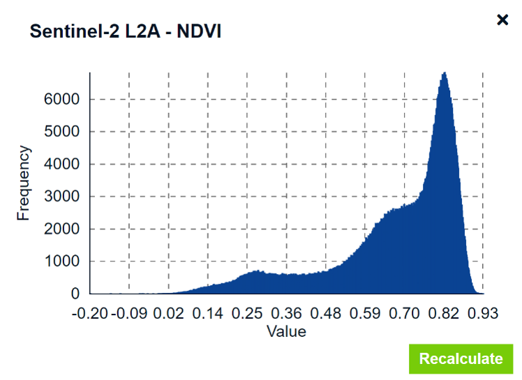 icon. The histogram is calculated for the data within your AOI, if defined or otherwise for the whole screen. This tool currently only works for index layers (e.g., the NDVI).