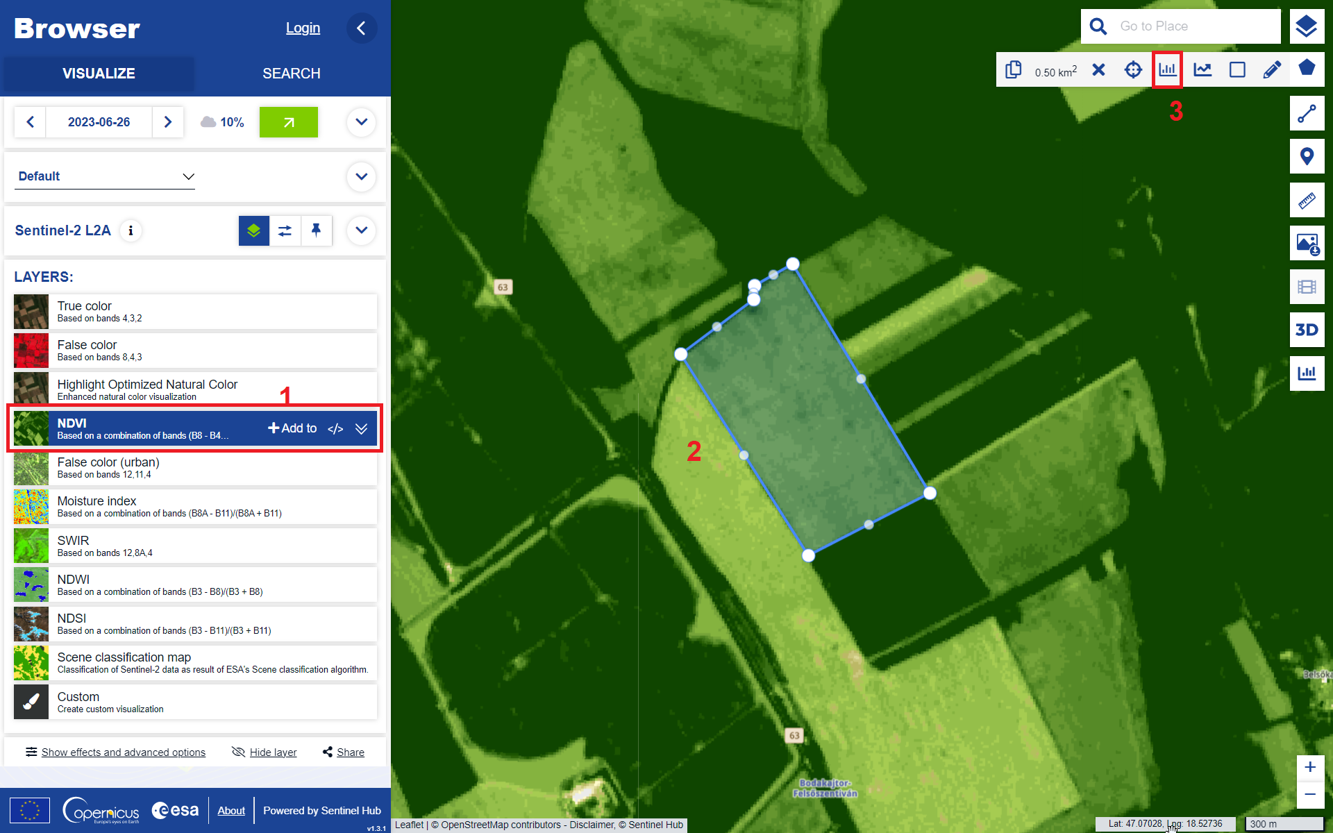 ) feature within the AOI tool, you can see how the value of an index has changed in time. To see this, it is necessary to choose a visualisation which give an index as output, (e.g., NDVI) or any single band. You can follow these steps to see an example Time Series of the NDVI of a single agricultural field.