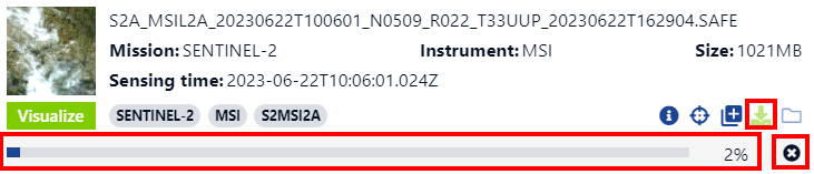) for the desired product in the results (in the sidebar or in the results panel on the map after selecting a product). After you click the button, a progress bar will appear below the product to indicate the status of your download. If you have started a download by mistake, you can cancel it by clicking on the “x” below the download button.