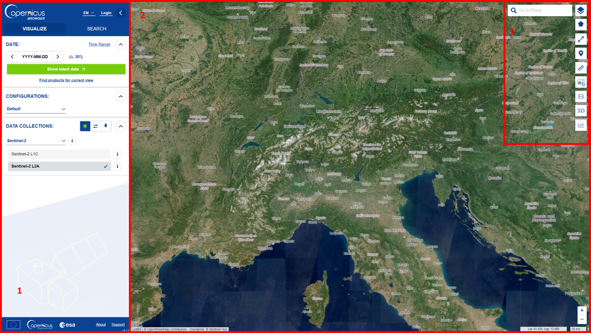 - In the sidebar, a maximum cloud coverage of 30% and the product type Sentinel-2 L2A are already preselected. To visualize the latest available data with cloud coverage below 30% click on the Show latest date button.