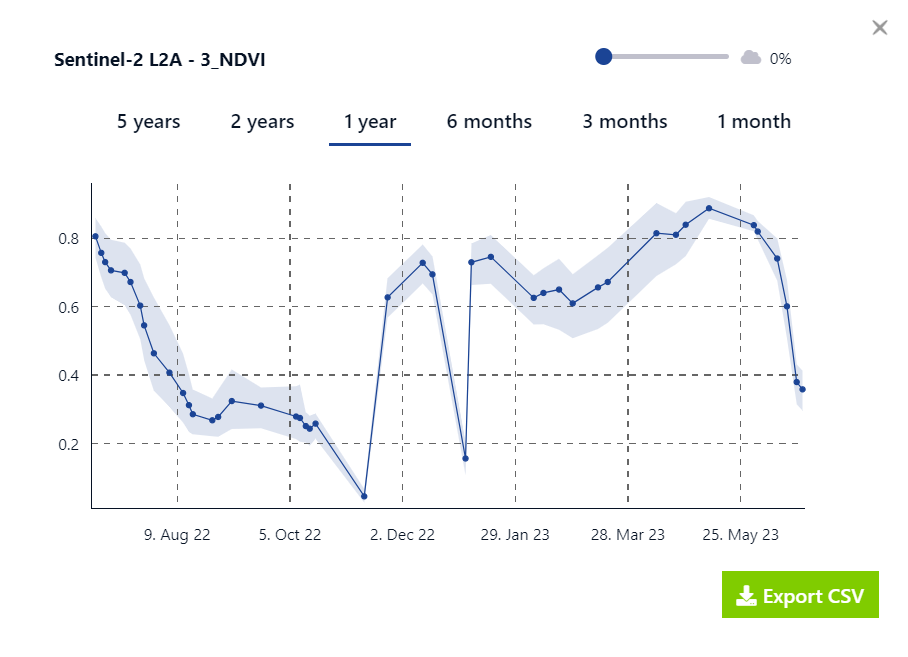 ) chart icon within the AOI tools. - You can choose the time over which you want to see the changes at the top of the graph that pops up. Due to the clouds being in the way and distorting the NDVI considerably (cloud NDVI values are low), the growth curve isn’t as orderly as one would have hoped. So you can also adjust the cloud cover to visualise the changes without distortion.