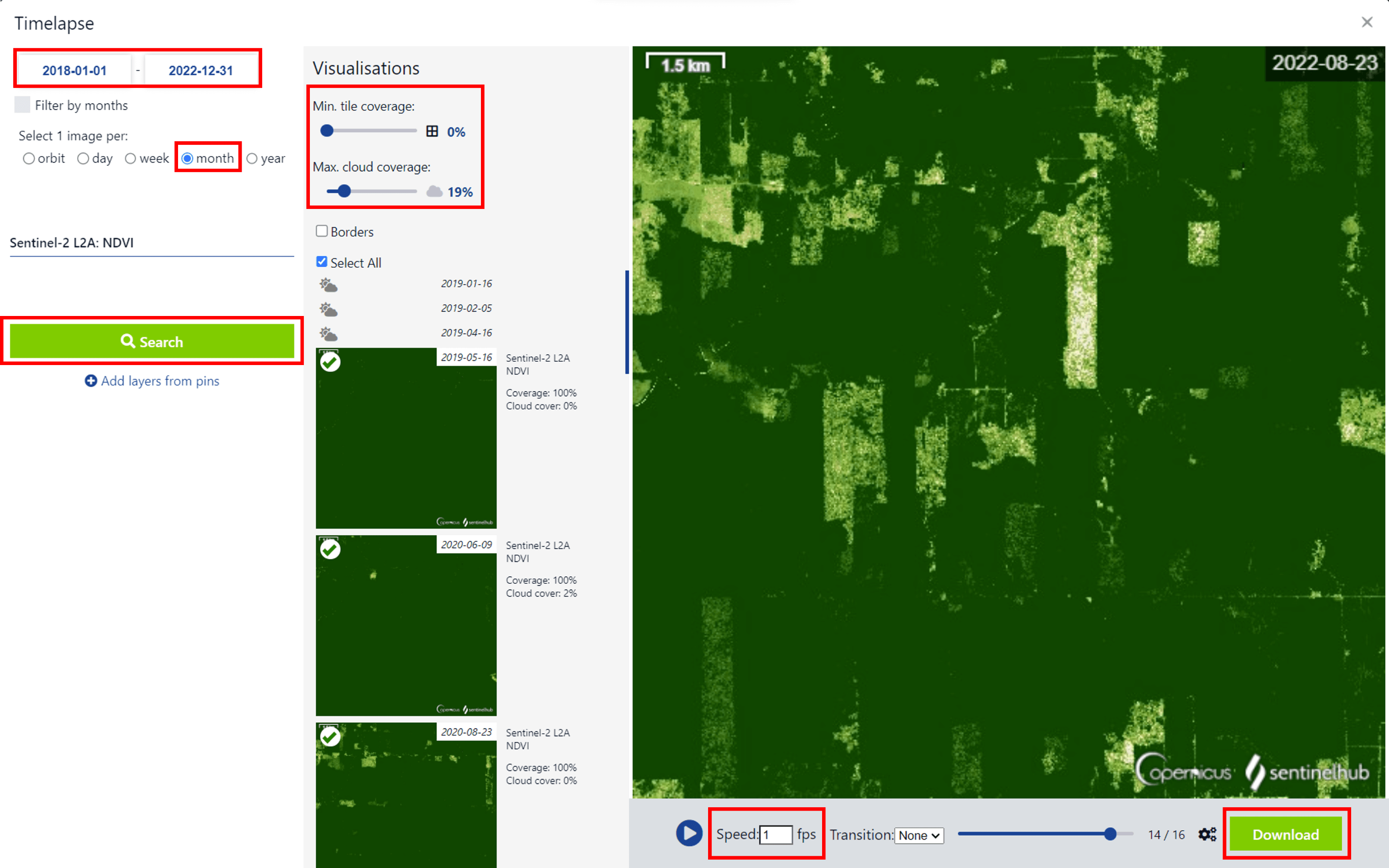 - Select 1 image per: month Alternatively, you can select only certain months in a year using the filter by months option. Click on Search to see all the results.