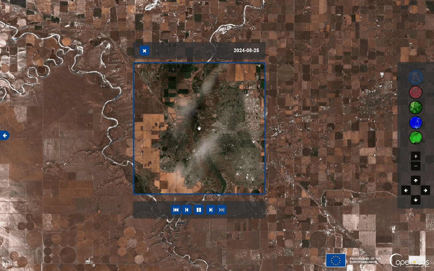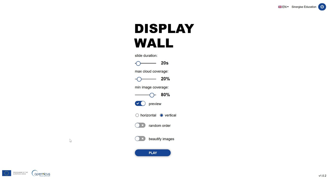 Once you log in, you start with the Setup view. Here, you can choose your preferred language, the duration of slide display, the maximum cloud coverage of images you display, and the minimum coverage of satellite imagery over the area of your pins. Note that these settings work differently to Copernicus Browser: the pins will not automatically show the latest cloud-free image that has sufficient coverage of your area of interest. The latest image will be displayed if it meets the requirements, and the pin will not be shown if it does not. If you receive the error message “No suitable image”, your pins are probably not static and all of them are cloudy on the most recent image. In this case, increase the cloud coverage threshold or make your pins static. Additionally, you can choose to display on a horizontal or vertical screen - this will influence where the preview images are shown. You can select the images to be displayed in random order (default is the order they were created in) and choose to beautify the images by contrast stretching (this option is currently disabled). Start the slideshow by clicking Play.