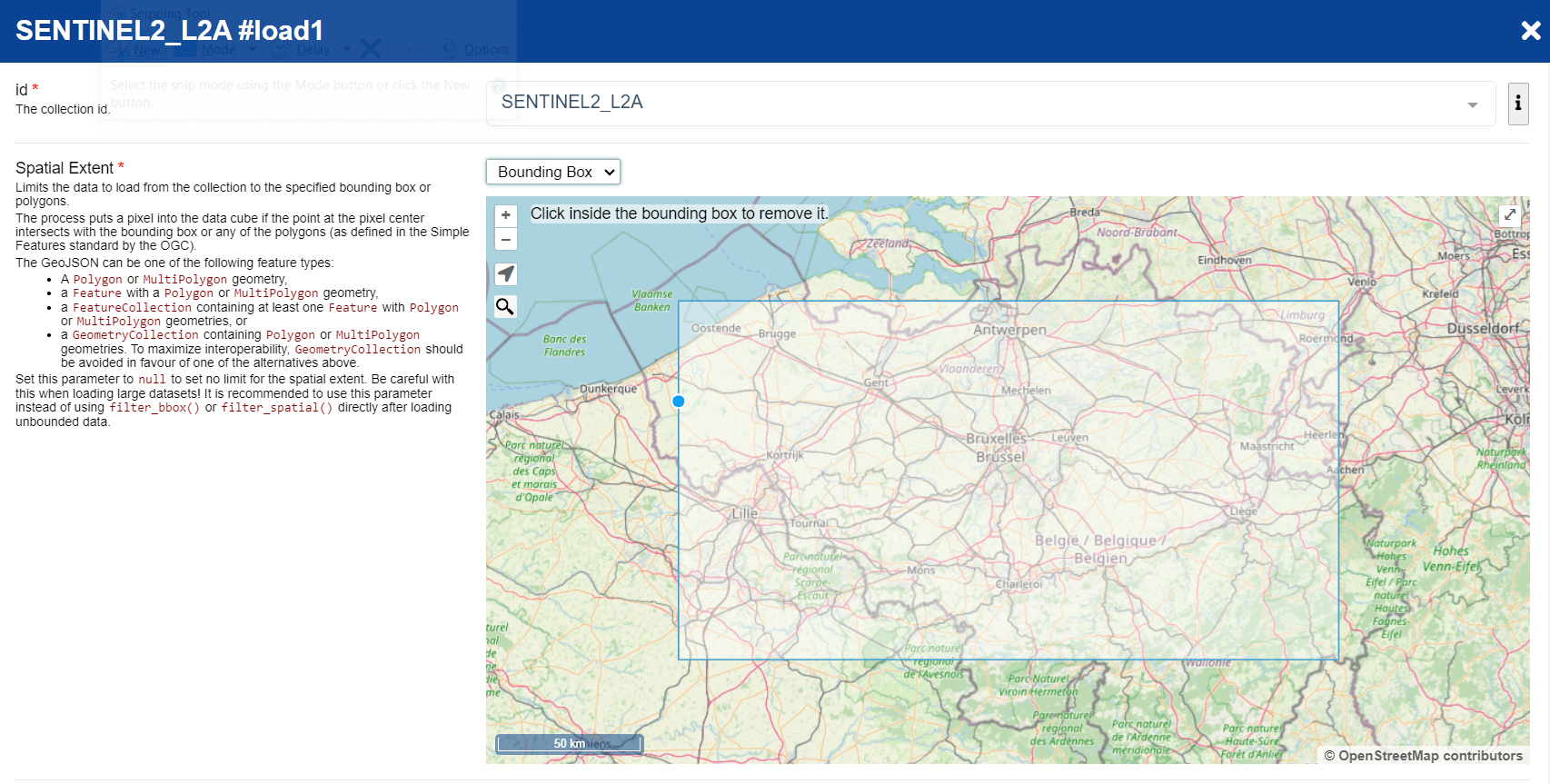 load_collectionopens a window where these parameters can be defined for subsequent processing. Users can choose between generating a bounding box or importing their spatial extent by dragging and dropping GeoJSON or KML files onto the map view to specify the area of interest. While this example demonstrates the use of a bounding box, it is suggested to experiment with a suitably compact area for testing purposes.
