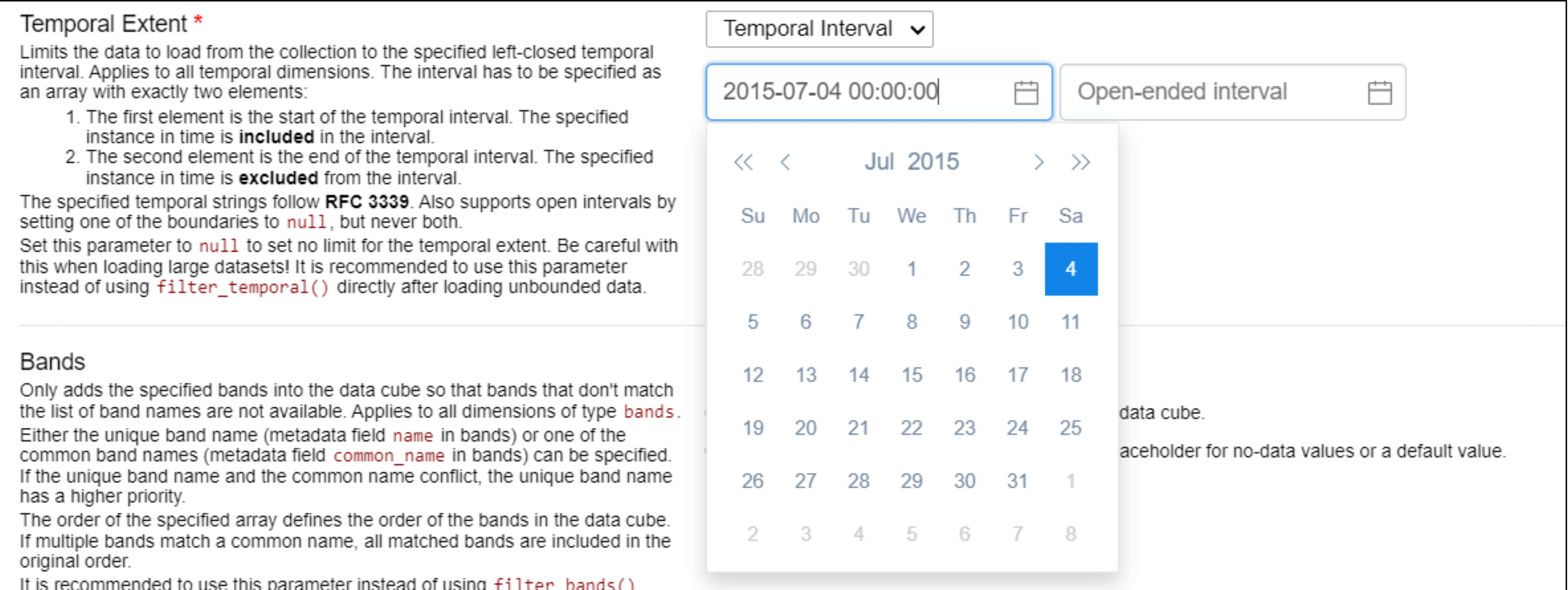 - Once a collection is loaded, several parameters must be specified, including the area of interest, temporal extent, and selection of bands. Clicking on