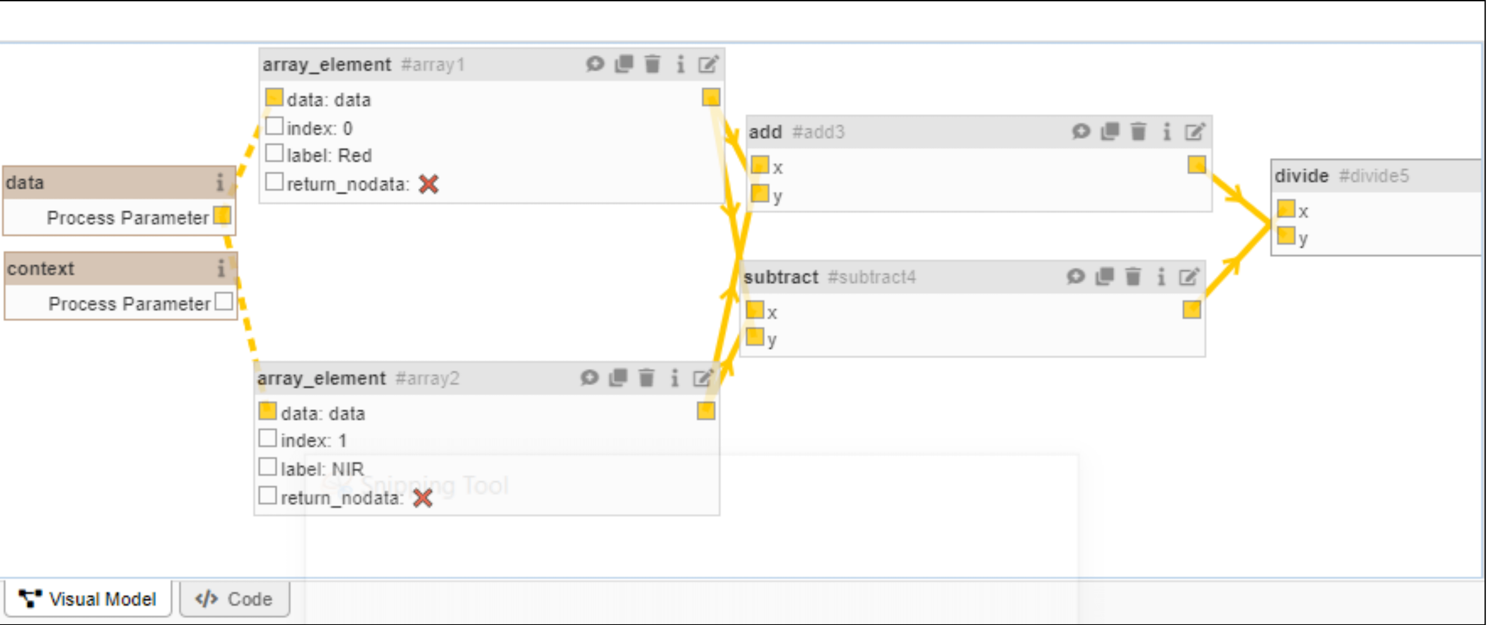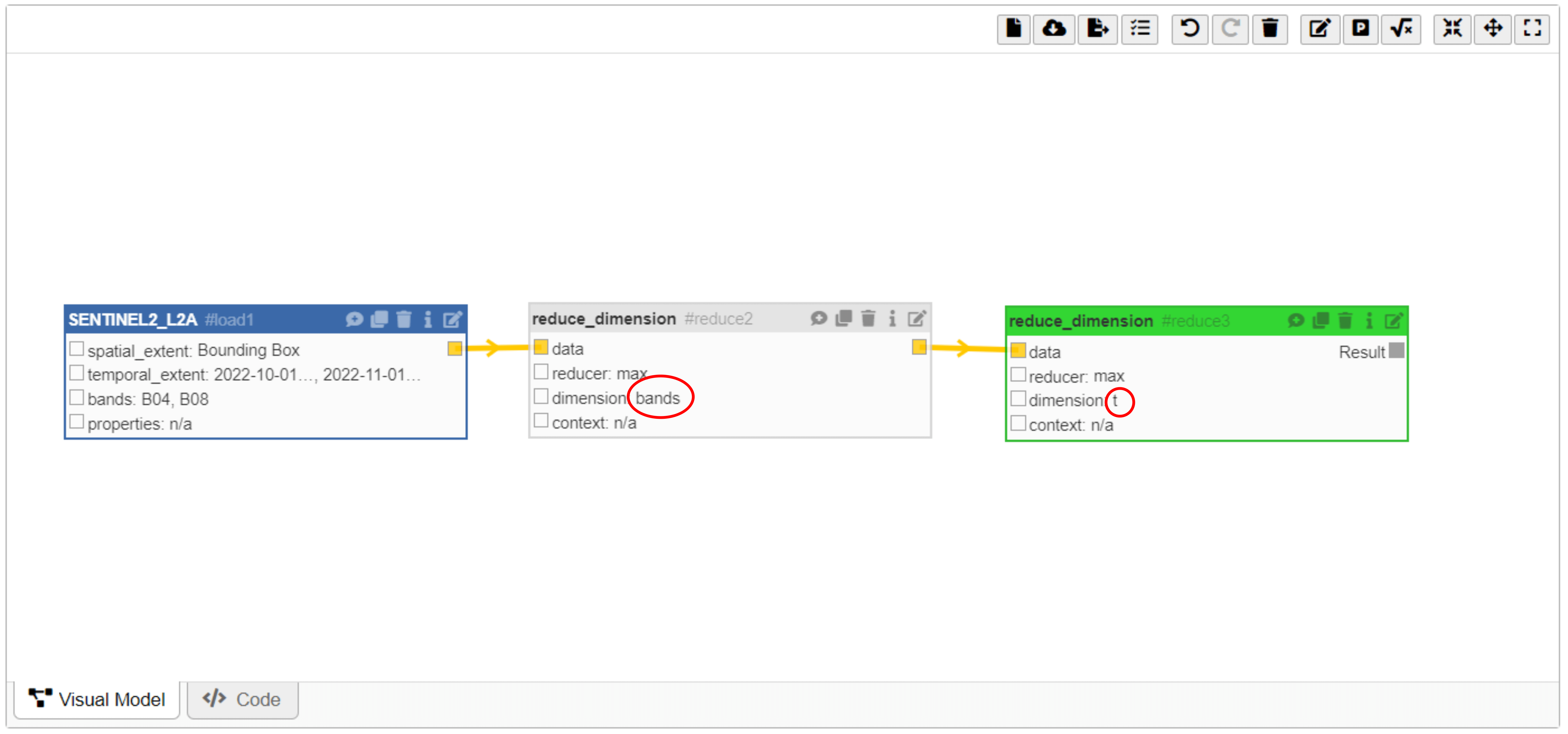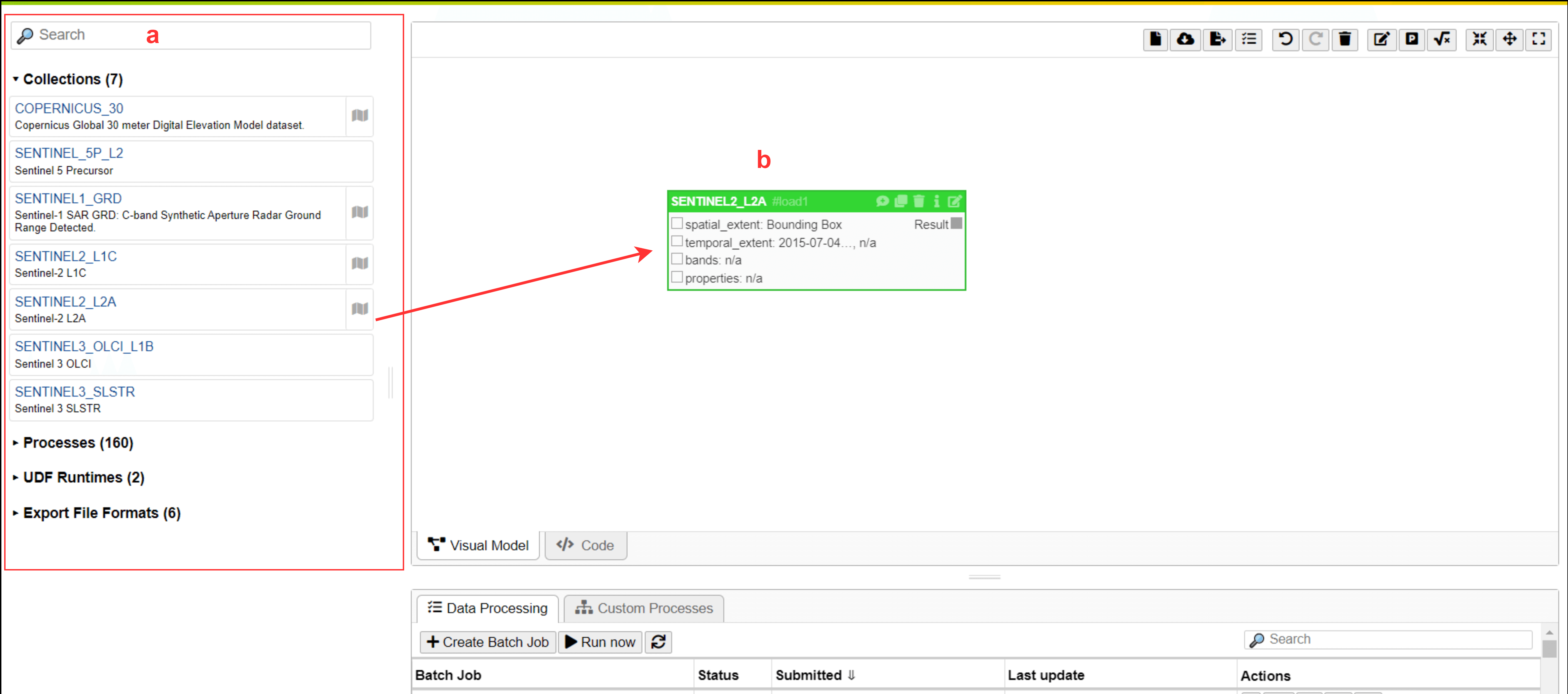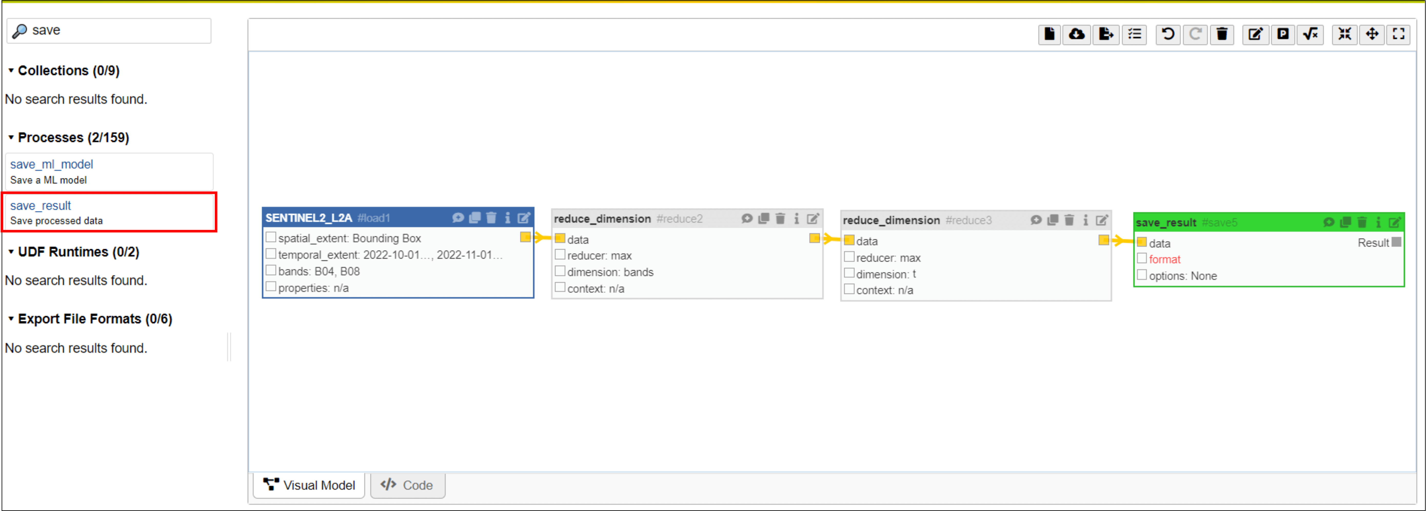 The Process Editor features both “Visual Model” and “Code” modes. In “Visual Model,” users can create processing chains by adding collections and processes and then connecting them. This mode simplifies the creation of workflows using a graphical interface. The “Code” tab lets users view the generated JSON workflow process as a process graph. This provides a detailed view of the workflow structure in a machine-readable format.