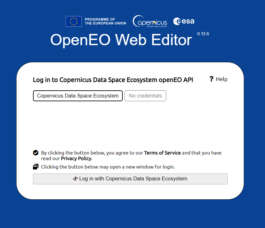 As previously mentioned, it is necessary to log in to interact with the server. As demonstrated below, a new window will appear when attempting to log in. While other options are sometimes available, the “Copernicus Data Space Ecosystem” is recommended authentication. For further information regarding various authentication methods or to seek assistance, click on the “help” option at the top or contact us.