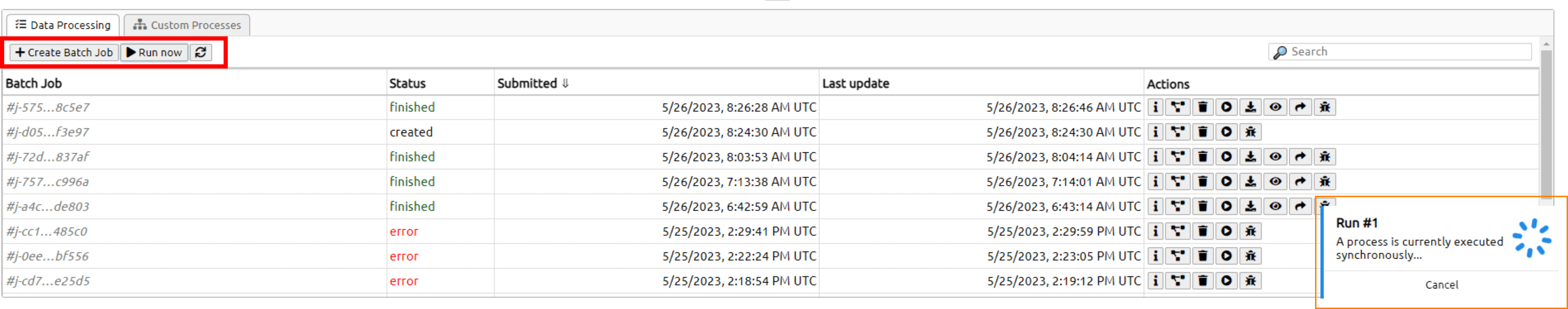 In the figure above, the red box includes the two methods possible for running the process. In this example, we used the synchronous method by directly clicking on Run now, which popped up a box in the bottom right corner.