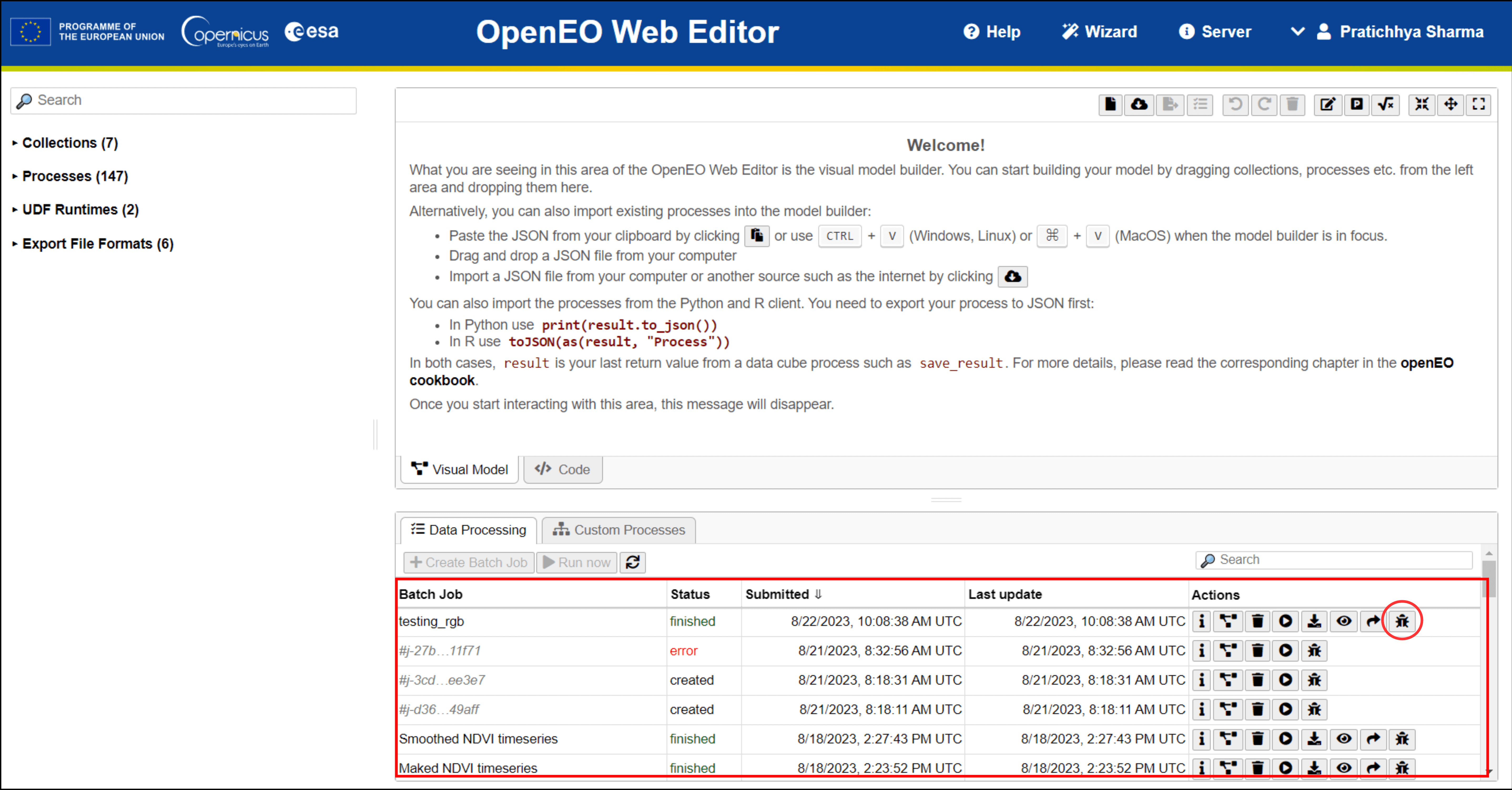 The basic functionalities that can be handy when creating the processes in openEO Web Editor are available in this row. These functionalities include creating a new script, importing processes from external sources, exporting in another programming language, validating processes on the server side, editing process metadata, adding parameters, etc.