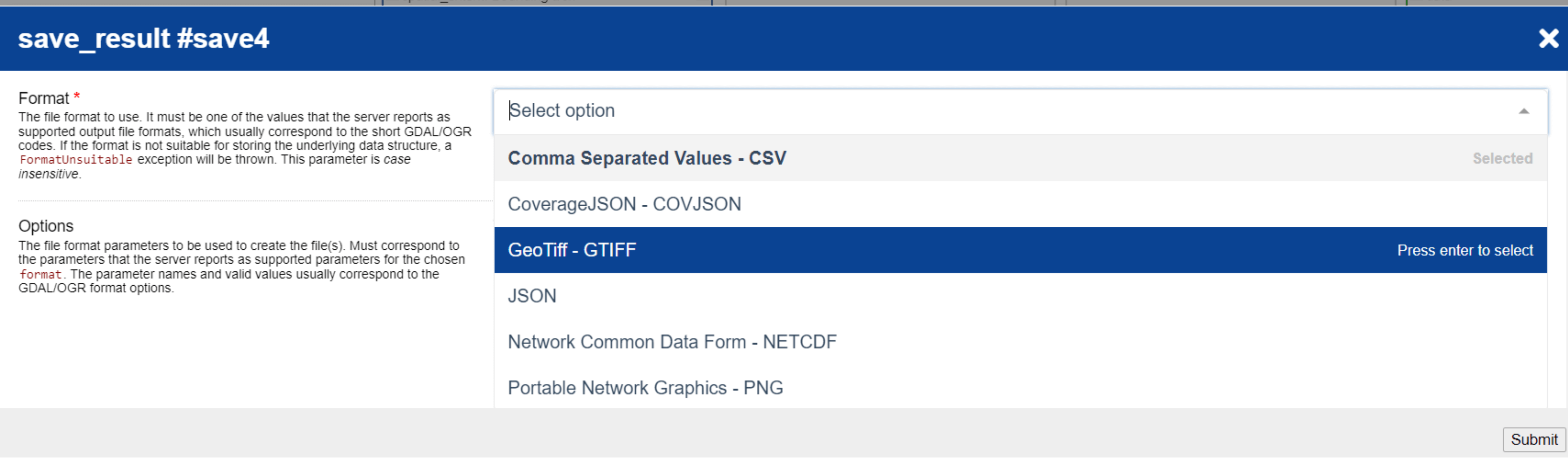 In the Export File Formats section, users are guided on the supported output formats within openEO. Clicking on each format provides a detailed summary of its associated parameters.