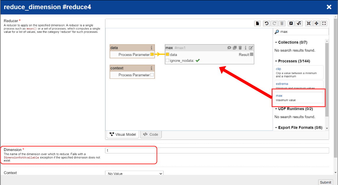 Following this, with the same reduce_dimension process, we eliminate the temporal dimension by selecting the maximum value using the max function.