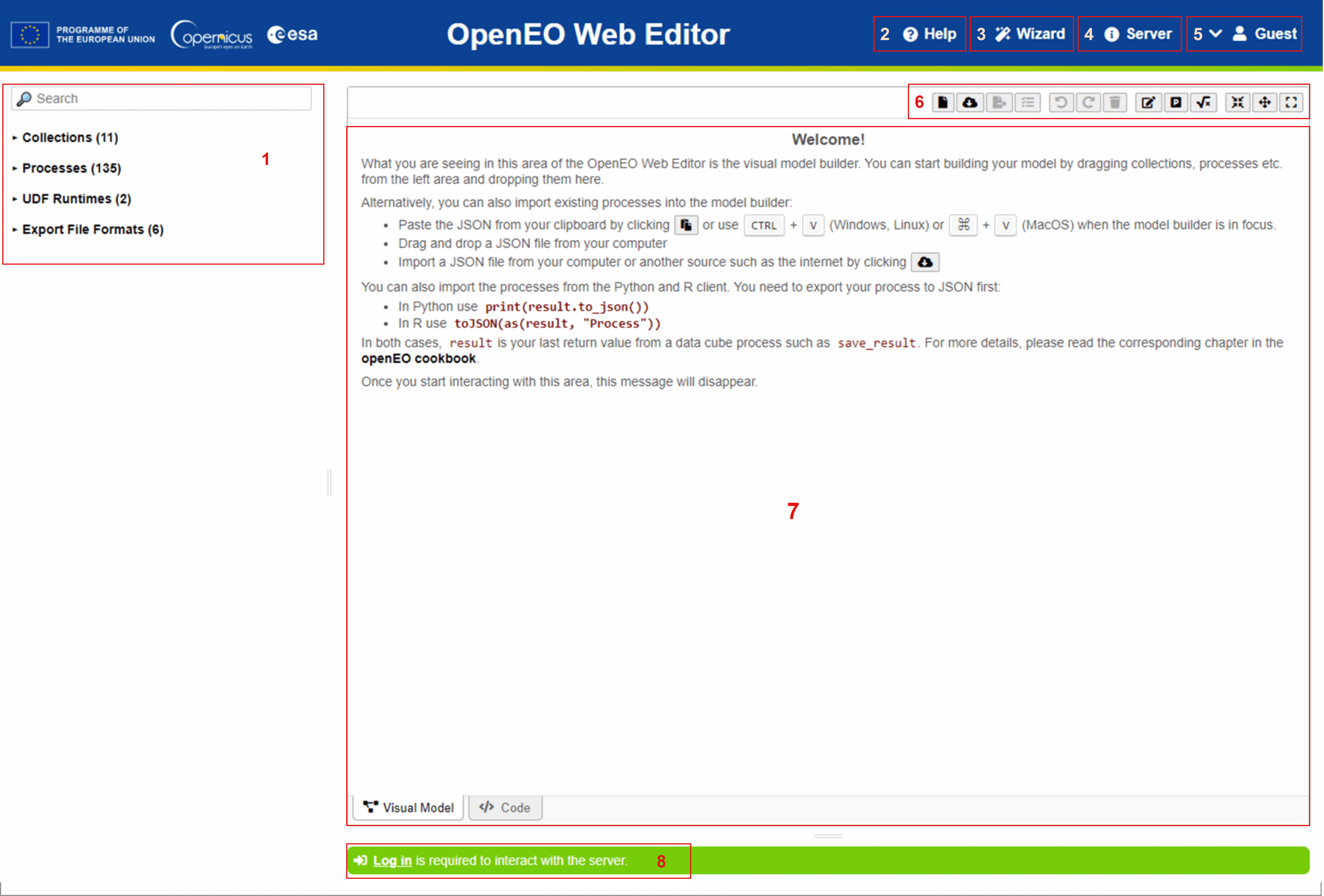 The openEO Web Editor can be accessed via https://openeo.dataspace.copernicus.eu/. Even without logging in, users can explore information on available collections, processes, User Defined Functions(UDF) Runtimes, and the options for exporting files. Additionally, users can create openEO process graphs; however, logging in is necessary to run them.