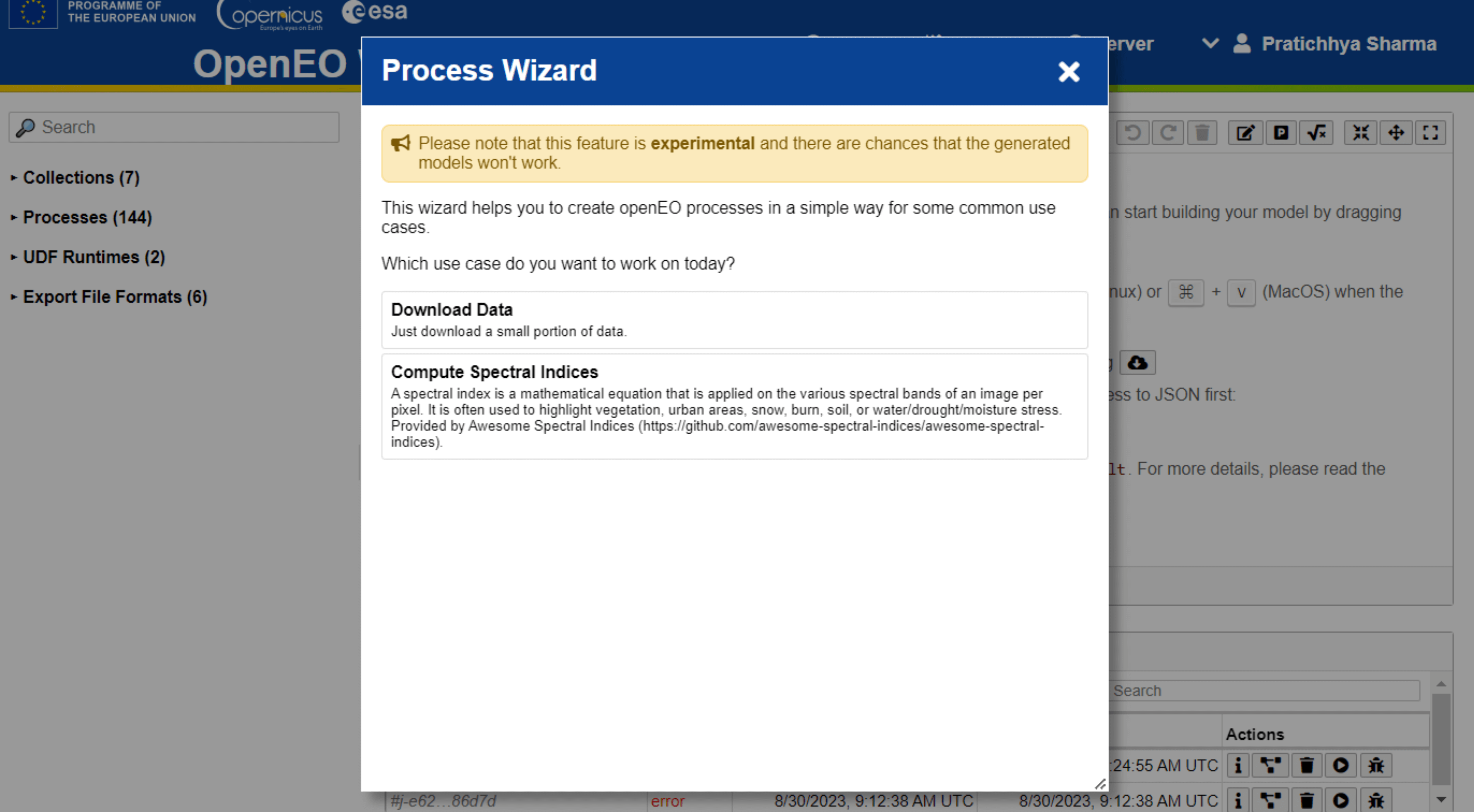 The Wizard is an experimental feature designed to simplify the creation of openEO processes for common use cases.