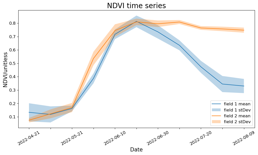 - Using Statistical API to produce NDVI time series for single and multiple fields.